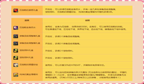 厄伽勒的感恩礼盒开启后, 可以获得厄伽勒变身药水, 并有一定几率在装备品级调整箱、宠物饲料、 厄伽勒的眼睛彩绘、 纯净的黄金增幅书中随机获得1种。