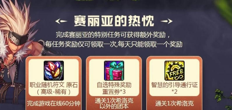 二、玩家每天在线60分钟可领1个随机符文原石(高级—稀有),通关一次希洛克以外的团本可获得3个自选特殊奖励重置券,通关一次希洛克团本可获得2个智慧的引导通行证。