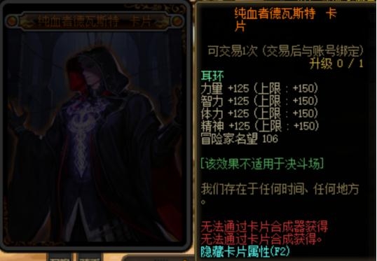 纯血者德瓦斯特卡片附魔的部位是耳环,其属性为四维+125,可升级一次,升级后的满属性为四维+150。就属性来看,是目前耳环附魔的顶级卡片,与魔界大战的BOSS黑眼之夏勒有同样的满属性。
