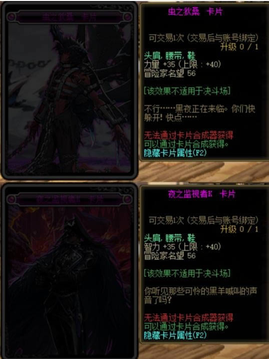 这两张卡片的属性分别为力量、智力增加35,满属性为40,可附魔的部位是头肩、腰带、鞋。无论是从属性还是可附魔的部位来看,这两张卡片都是妥妥的坯子神器卡,没有太多可讲的地方。若是翻金牌翻到这两张卡片,那可能要白高兴一场了。