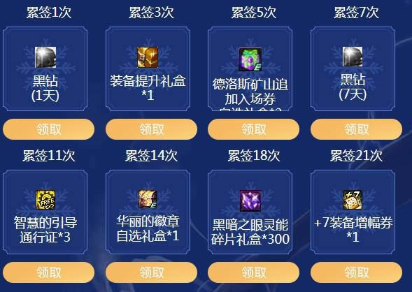 每连续签到2天,可获得1次免费抽奖资格,奖池于12月25日开放至1月17日结束