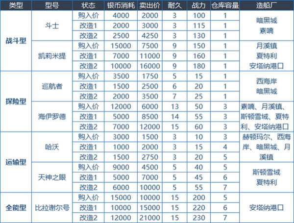 在不同城镇的造船厂中,可以购买到不同型号的飞空艇,飞空艇可以改造2次,改造后根据飞空艇类型的不同,增加对应的属性。