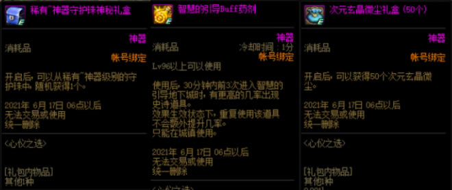 包括各种特殊地下城入场卷,本职业稀有护石,闪耀会长礼盒,稀有-神器守护珠礼盒,智慧引导BUFF药,次元玄晶徽尘。