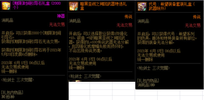 包括200个时间引导石,暗黑圣战武器,代号希望套装,100及史诗武器罐子,时空传说装备自选,枪剑士三绝武器装扮。