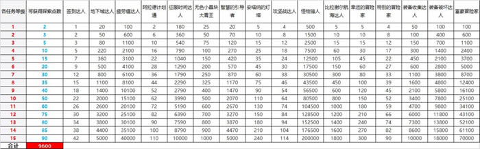 下图为每一级任务对应的探索点数以及完成的数量如下图【没办法,每个任务的东西实在太多】,合计9600点探索点数