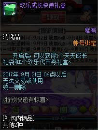 天天成长礼袋开启后,可以获得1个增加15%经验值的成长胶囊 (Lv1~88)。礼袋每天可以开启1次,并在获得后的7天后删除。
