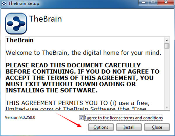 1、在本站下载Thepain 9安装包,内含主程序及特别补丁,解压缩并运行主程序,勾选我同意许可协议,点击Options设置