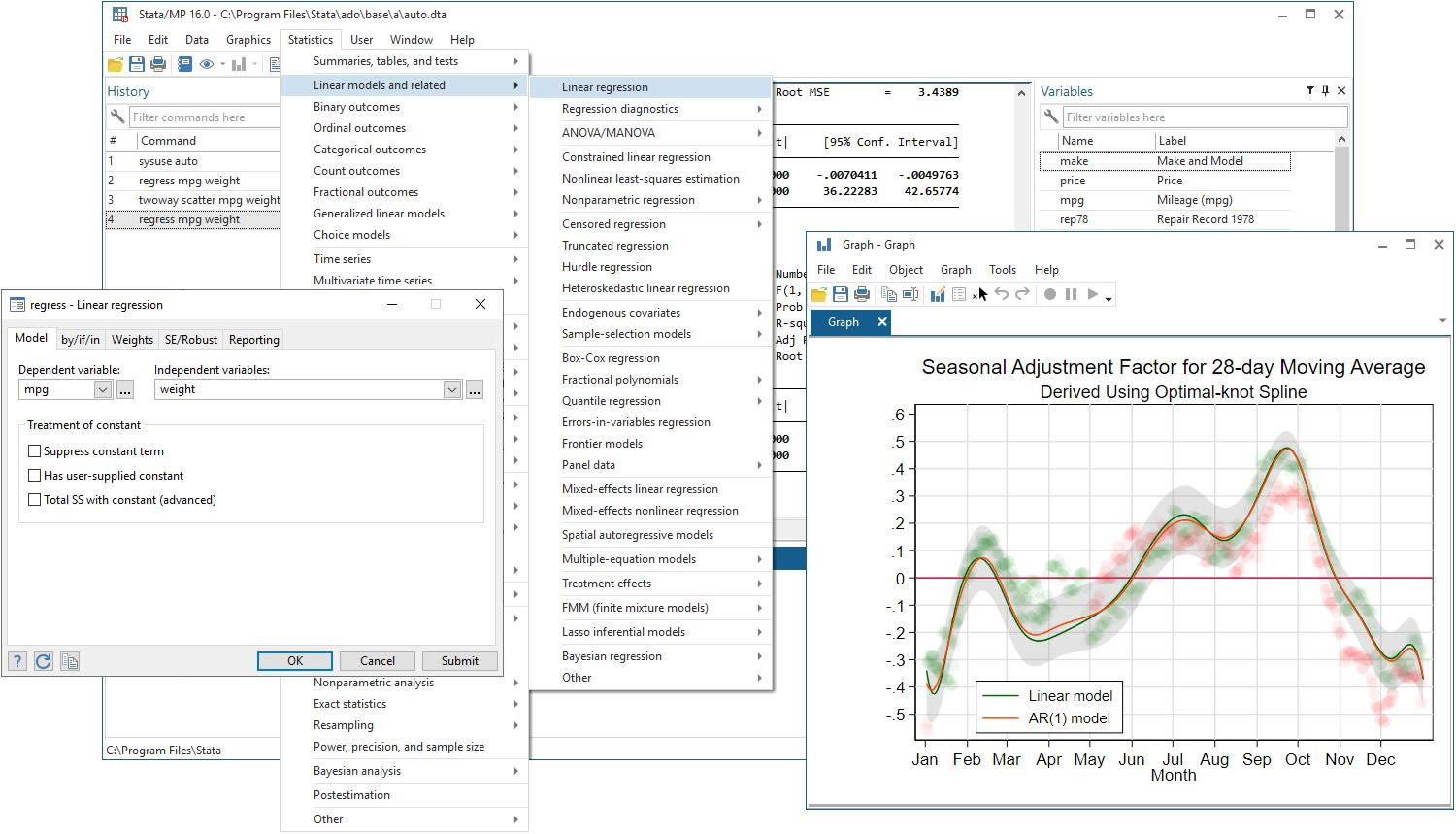 相关与回归分析:简单相关,偏相关,典型相关,以及多达数十种的回归分析方法,如多元线性回归,逐步回归,加权回归,稳键回归,二阶段回归,百分位数 ( 中位数 ) 回归,残差分析、强影响点分析,曲线拟合,随机效应的线性回归模型等。