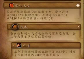 剖心飞刀:基尔罗格对你的心脏投出一把刀,造成266000-294000 点物理伤害,外加每秒33000点物理伤害。 直至你被完全治愈。