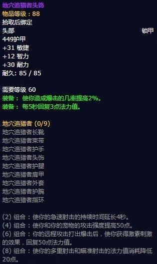 地穴追猎者对于猎人的提升就不必多说了,单是套装属性减蓝就非常不错,大大缓解了猎人缺蓝的窘境。2套组合效果是 使你的急速射击的持续时间延长4秒;4套组合效果是 使你和你的宠物的攻击强度提高50点;6套组合效果是 你的远程攻击打出爆击后,使你获得激素刺激的效果,回复50点法力值;8套组合效果是 使你的多重射击和瞄准射击的法力值消耗降低20点。