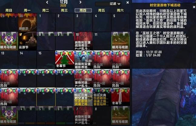 我们打开游戏中的日历可以看到,在本周四的日历上,清楚地标着时光漫游地下城活动,此次时光漫游是9.0版本首个时光漫游团本,在原本的计划中首次时光漫游的时间还要靠前,并且是开燃烧的远征,但因为9.0版本跳票,首个时光漫游团本到本周CD更新后才会开始。