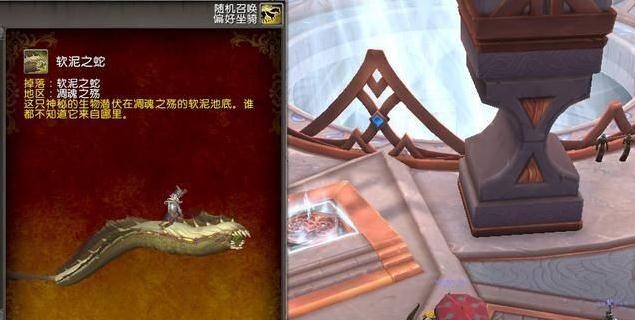 9.0版本的首个解谜坐骑名为“软泥之蛇”,这款坐骑与7.0版本的谜语人灵蛇相同模型,无非就是配色不同罢了。在坐骑栏中这款坐骑的掉落地区为《凋魂之殇》副本,描述是潜伏在凋魂之殇的软泥地底。