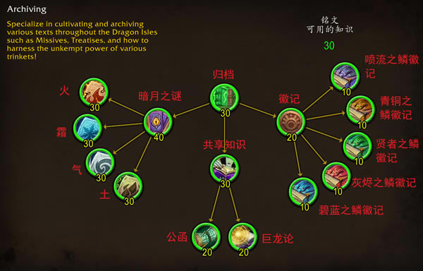 归档:擅长归档整个巨龙群岛的各种文本,在这个专精中每点获得+1制作技能。共计消耗30点知识点数。其中