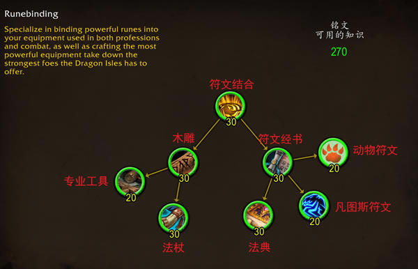 动物符文:成为破译与巨龙群岛动物有关的符文专家,在这个专精中每点获得+1制作技能。共计消耗20点知识点数。其中