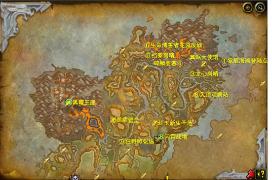 为了方便阅读,在觉醒海岸的地图用数字标注做主线任务的路线
