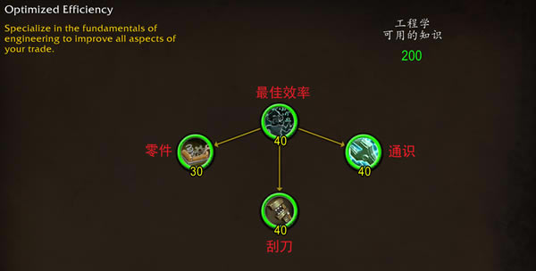 最佳效率:专注于一般预防措施和技术,是所有工程师的宝贵技能,在这个专精中每点获得所有工程制作+1技能。共计消耗40点知识点数。其中