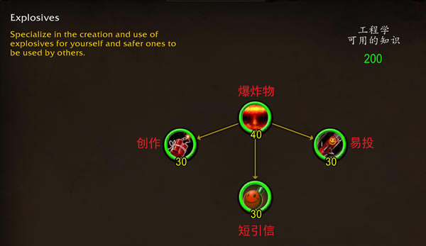 易投:专门生产易投炸药,这种炸药价格昂贵,但对非工程师来说是更安全的爆炸物,在这个专精中每点获得易投炸弹制作+1技能。共计消耗30点知识点数。其中
