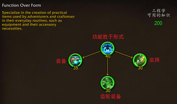 功能胜于形式:专注于创造冒险家和工匠在日常工作中使用的实用物品,在这个专精中每点获得与设备及其改进有关的所有制作+1技能。共计消耗40点知识点数。其中