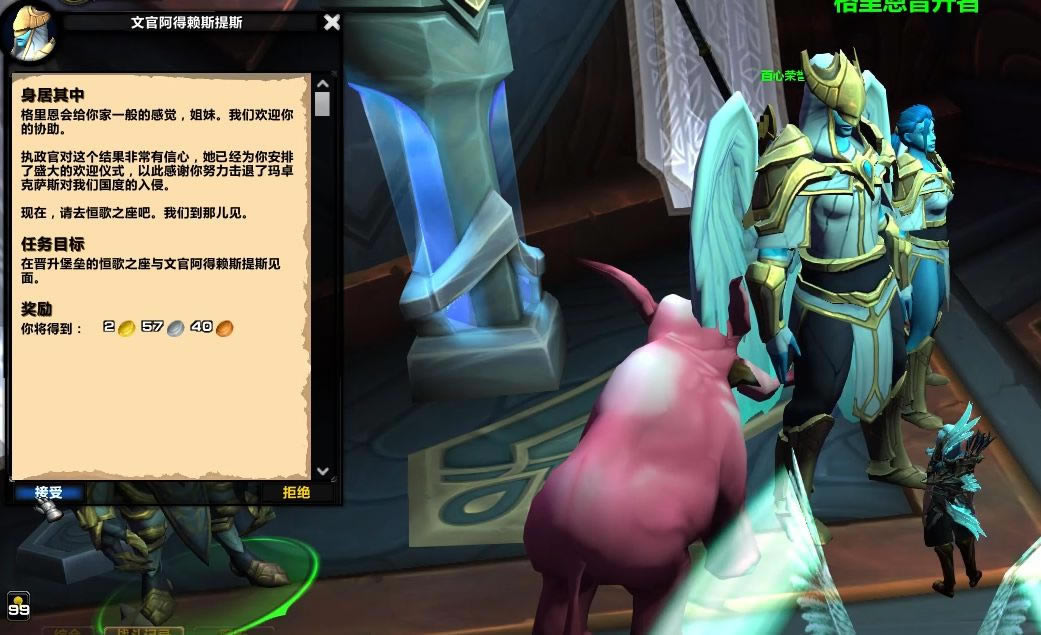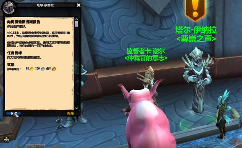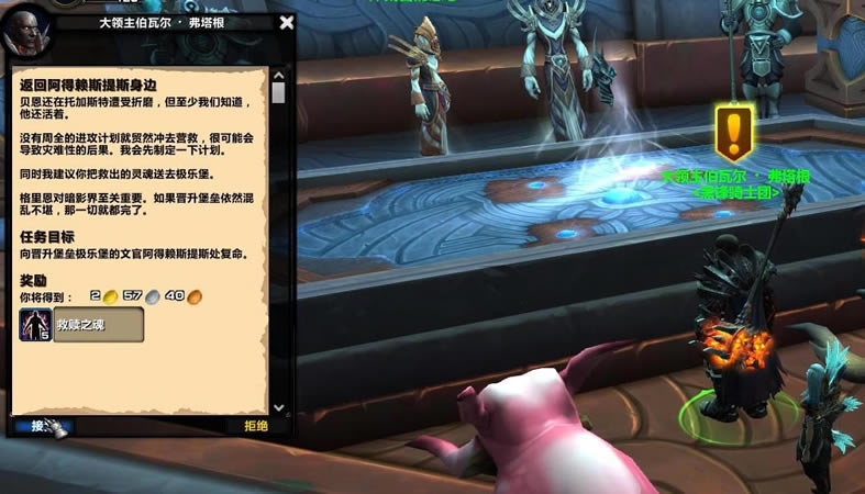 和他对话完成后,大领主伯瓦尔.弗塔根和尊崇之声会为你提供引导你前往格里恩盟约大厅和送你一些材料的任务。不要白不要,全部接受,然后根据任务指引,准备前往格里恩的盟约大厅。