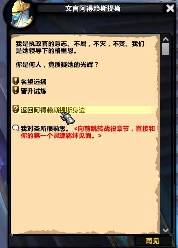 这里我已不跳过引导为例,NPC们告诉了我在哪里看名望,哪里给盟约大厅升级等内容后,就带我去绑定灵魂羁绊了。