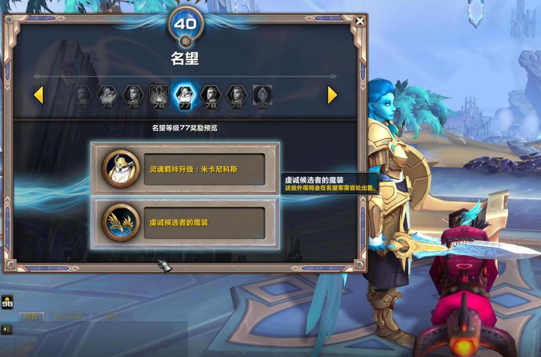 这是因为掮灵的卓越印记仅给了我们40名望,和名望管理员对话也发现的确如此。格里恩40~80名望的全部内容,如幻化,灵魂羁绊插槽,坐骑,头衔等也都需要我们到达名望要求后才能解锁。
