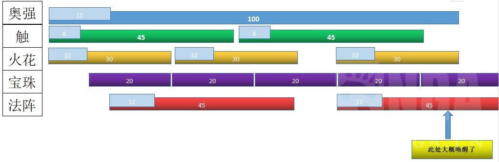 有奥强的大爆发:提前18C祥和--火花--触--奥强--魔爆术*2--弹幕--宝珠--读条奥冲--弹幕--奥爆*4--弹幕(有节能打飞弹消耗后再弹幕)