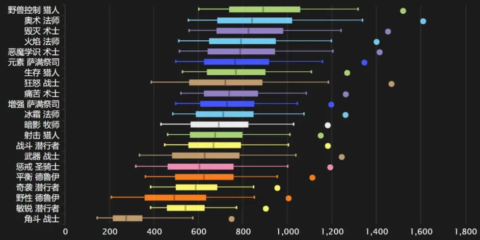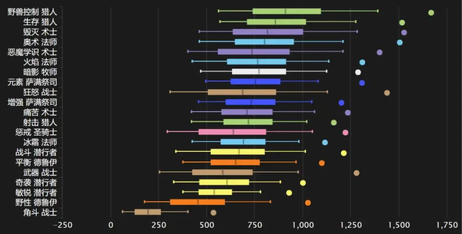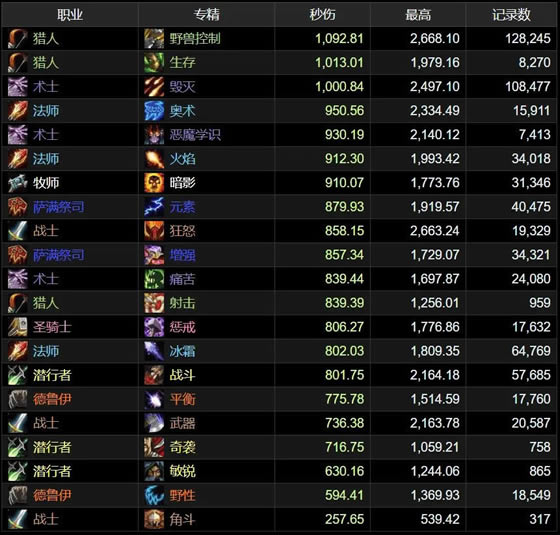 而近战职业目前处境非常悲催,狂暴战和增强萨满目前在近战中排名靠前,但是也在暗牧和元素萨的后面。盗贼、武器战和野德则和猎术法形成鲜明对比,牢牢霸占了排行榜的后面几位。
