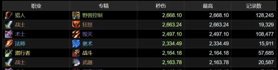 如果我们把排行换成到以各职业最高dps排行的话,近战倒是有了一点尊严。狂暴战与最强的职业兽王猎并驾齐驱,盗贼也排到了第五的位置,甚至连武器战都跻身到第六。