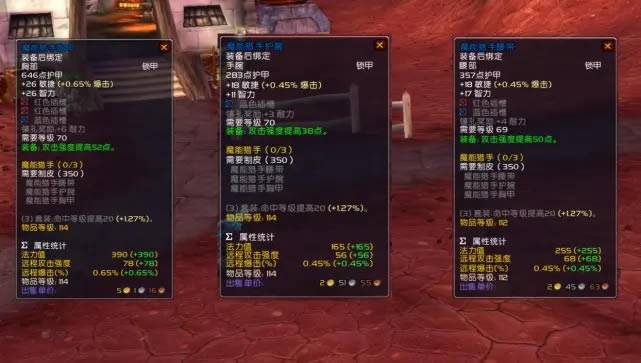 魔能猎手套装的部件同样是胸甲,护腕以及腰带,这与另外两套装备完全一致,因此魔能猎手与另外两种套装的属性区别可以非常直观的对比出来。