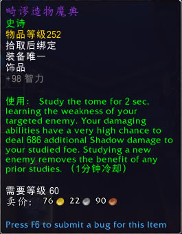 使用:研究魔典了解敌对目标的弱点,你的伤害技能有很高几率造成686点额外的暗影伤害对你的研究目标。
