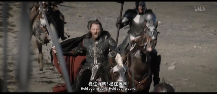 稳住阵脚!稳住阵脚!刚铎众子,洛汗众子,我的手足兄弟!我从你们眼中,能看见同样会紧攫我心的恐惧。或有一日,人类皆会失去勇气,我们与友相弃,断绝一切羁绊同盟,但绝非今日。那时或有群狼当道,盾牌尽碎,人类纪元面临土崩瓦解,但那绝非今日!