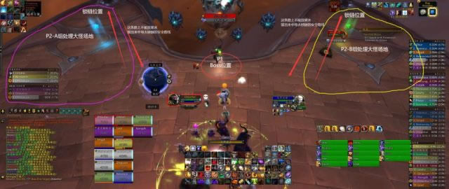 全场分左中右三块场地,P1在中场输出Boss,处理拔河机制,P2全团分为AB两组分别去左右场地处理P2的两只眼球大怪,同时击杀掉眼球大怪后转场回P1。