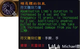 通灵领主——憎恶之狂:憎恶附肢的持续时间延长4秒,提供白骨之盾/白霜/符文腐蚀的频率提高2秒。此外,被憎恶附肢拉到的敌人受到你的伤害提高10%,持续12秒。