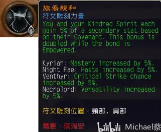 4个盟约有对应的盟约橙装,目前盟约橙装掉落未知,制作方式未知,效果未翻译,目前只有战士(2个)、死亡骑士(3个)、法师(3个)、德鲁伊(4个)、萨满(1个)、潜行者(3个)、圣骑士(3个)、恶魔猎手(3个)制作了部分的盟约橙,其他职业都未制作,新橙装目前还是需要值得高度关注的,如果新橙效果理想,不排除会更换盟约,例如9.0法夜射击猎配巨蛇追猎者橙,有二段触发野性之魂(盟约技能)联动效果。
