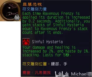 罪恶的歇斯底里:你的伤害和血量增加2%,急速增加1%,可叠加,持续5秒。