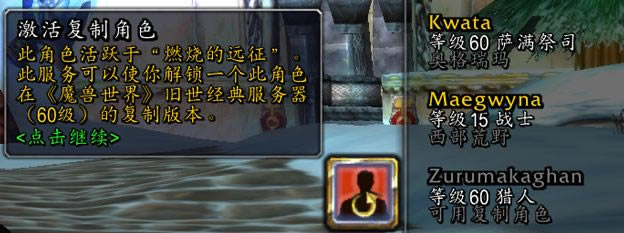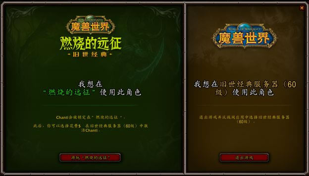 玩家需要选择每一个可用角色的游戏类型。在任意客户端中首次尝试登录角色时,系统将会要求玩家确认,是否要在该游戏中激活角色。当玩家选择了游玩的服务器后,该角色在另一服务器中的复制体将无法使用,当然,你也可以通过可选的付费服务“复制”角色,使得该角色在加入 “燃烧的远征”的同时,也有一个复制体能于旧世经典服务器中继续冒险。需要注意的是,创建的复制体为“燃烧的远征”前夕补丁发布前的快照,不包含该时间点后的任何后续提升。
