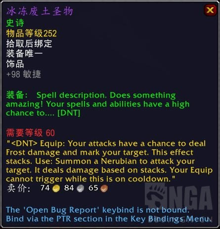 描述:装备:自动攻击有几率对目标造成冰霜伤害并标记目标,效果可叠加。使用:召唤一只蛛魔攻击你的目标,伤害随叠加的层数提高。若饰品正在冷却中,装备效果不会触发。