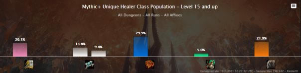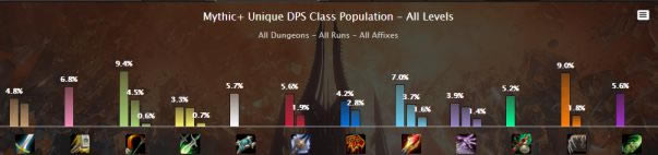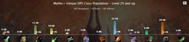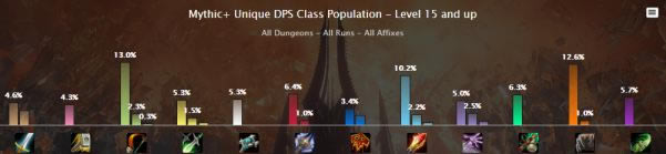 由于射击猎的削弱,在15+的大秘境中,射击的占比本周出现了下跌的痕迹,其它职业的占比和上周基本类似,可能是由于9.0.5版本刚更新的情况,导致了玩家对部分职业还是存在着既有的偏见。实际上,如冰DK,元素萨等职业在新版本更新后已经会有非常不错的表现了。