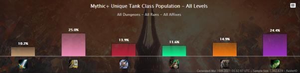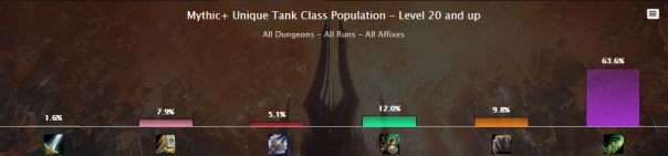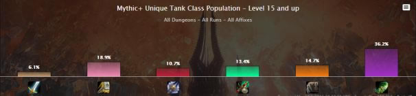 在20+的大秘境中,DHT的占比持续跌破70%的统治地位。除了战士外,其他的坦克占比都有少许提升。