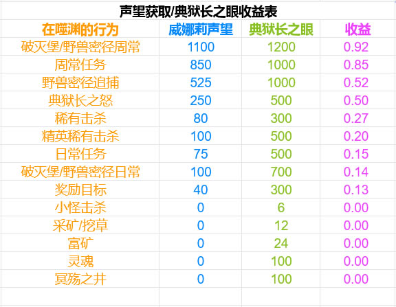 还在刷声望的可以看声望获取/典狱长之眼收益表: