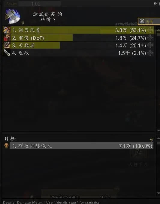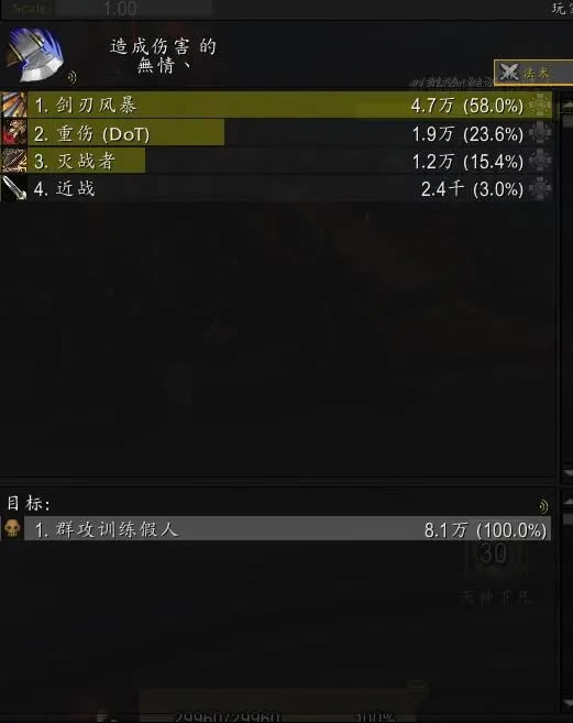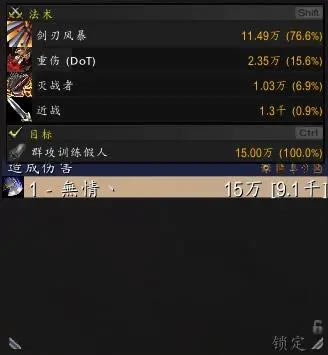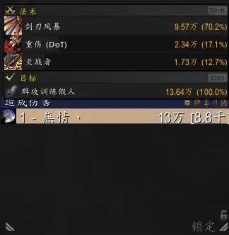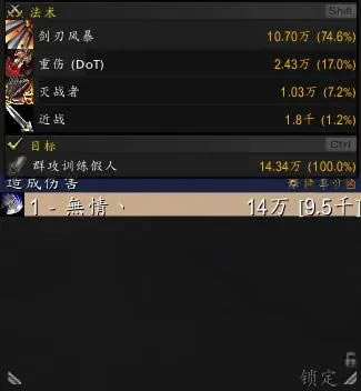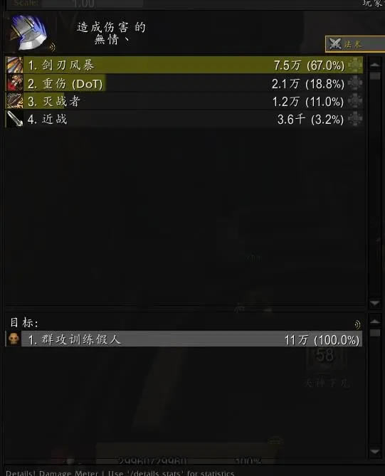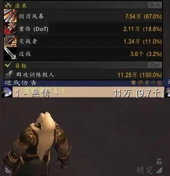 去掉了一个触发急速的SP防止有波动,所有测试均在5目标木桩上,并且最后流完了重伤DOT,如有错误,欢迎指正。装等197,附上属性图给各位一个参考