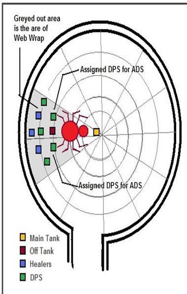 蛛网裹体:进入战斗后20秒施放,之后40秒施放一次。以BOSS为中心,将除当前MT外随机3个玩家按照他们与BOSS的直线击飞到场地的墙壁上并且被蛛网包裹,随后造成每2秒750点左右的自然伤害。虫茧生命值大约6000点,可被攻击摧毁。