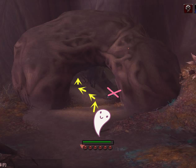 这个比较难找。首先到悬崖上,拿上羽毛,跳下去,如图箭头方向沿着树枝走上去,进山洞,杀死野怪物后才能对战。不要走黄X那条错路。