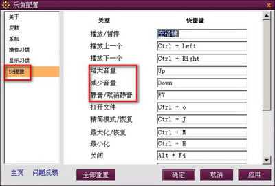 4、往往还有很多网友喜欢用快捷键,因为这样用起来方便也基本 ,只要记得 快捷键直接运用 而不必用鼠标,当然不同的软件不同的操作都会有快捷键,那么初次运用 乐鱼影音盒在哪里找到快捷键来调节音量呢?点击右上角的乐鱼配置按钮,选择快捷键,进入快捷键窗口,如下图所示: