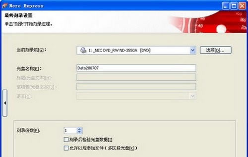 6、打开“最终刻录设置”对话框,在“当前刻录机”下拉列表中选择准备使用的刻录机,然后在“标题(光盘文本)”和“演唱者(光盘文本)”编辑框中分别输入自定义的信息。然后选中“刻录后检验光盘数据”复选框,并单击“刻录”。