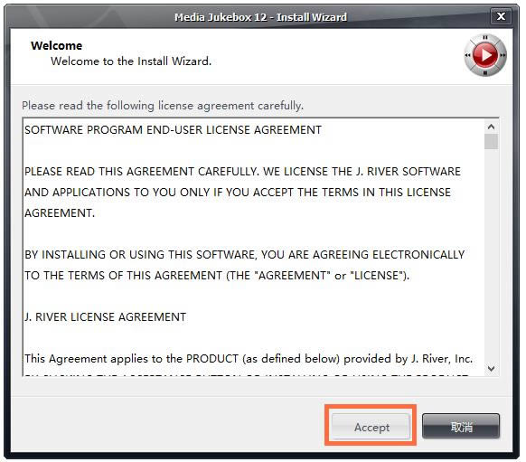 下载Media Jukebox软件,解压压缩包,双击.exe文件,根据向导操作,阅读协议,点击【accept】,