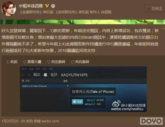 徐昌隆先生在其微博上表示:“好久没发微博,简单说下.1)新的更新,年前送交测试,内容上新增武功,包含双武;新增两个可攻略女角;增加东厂大忠线的内容2)Steam测试中,还要陆续调整英文的显示3)外传规划差不多了,希望今年能上4)金庸类型新作持续进行中5)团队扩编,年后能同时进行两个项目了6)大家新年快乐,2016继续给河洛支持”。