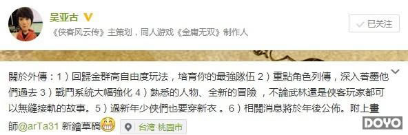 不仅如此,《侠客风云传》的主策划亚古还对这个策划中的外传进行了补充说明:“关于外传:1)回归金群高自由度玩法,培育你的最强队伍 2)重点角色列传,深入着墨他们过去 3)战斗系统大幅强化 4)熟悉的人物、全新的冒险 ,不论武林还是侠客玩家都可以无缝接轨的故事。5)过新年少侠们也要穿新衣 。6)相关消息将于年后公布。”