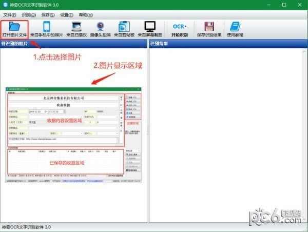 第一步:打开等待识别文字的图片,支持图片文件、来自手机中的图片、来自扫描仪的图片、摄像头拍照、来自剪贴板的图片、来自屏幕截图,打开之后图片会显示在左侧“图片显示区域”内,界面如下: