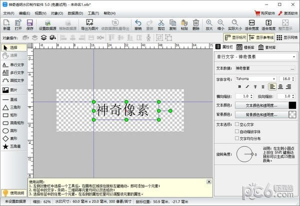 软件界面主要由标题栏、操作按钮区域、工具栏、透明水印编辑区域、属性栏、模板库、素材库、缩览图等区域构成。其中*常用的是工具栏、属性栏和透明水印编辑区域。